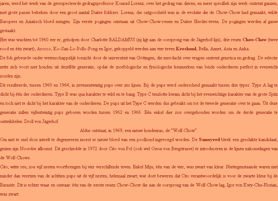 In 1972 krijgt Konrad Lorenz één van de eerste Eurasiërs cadeau, Nanette vom Jägerhof; die volgens hemzelf de beste hond was die hij ooit gehad heeft.